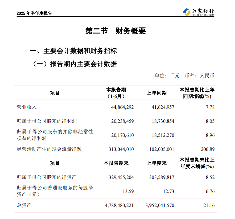 22日,江苏银行股份有限公司(下称江苏银行600919.SH)披露的2025年半年度报告显示,该行上半年实现营收净利双增,资产总额达到4.79万亿元,较上年末增长21.16%。