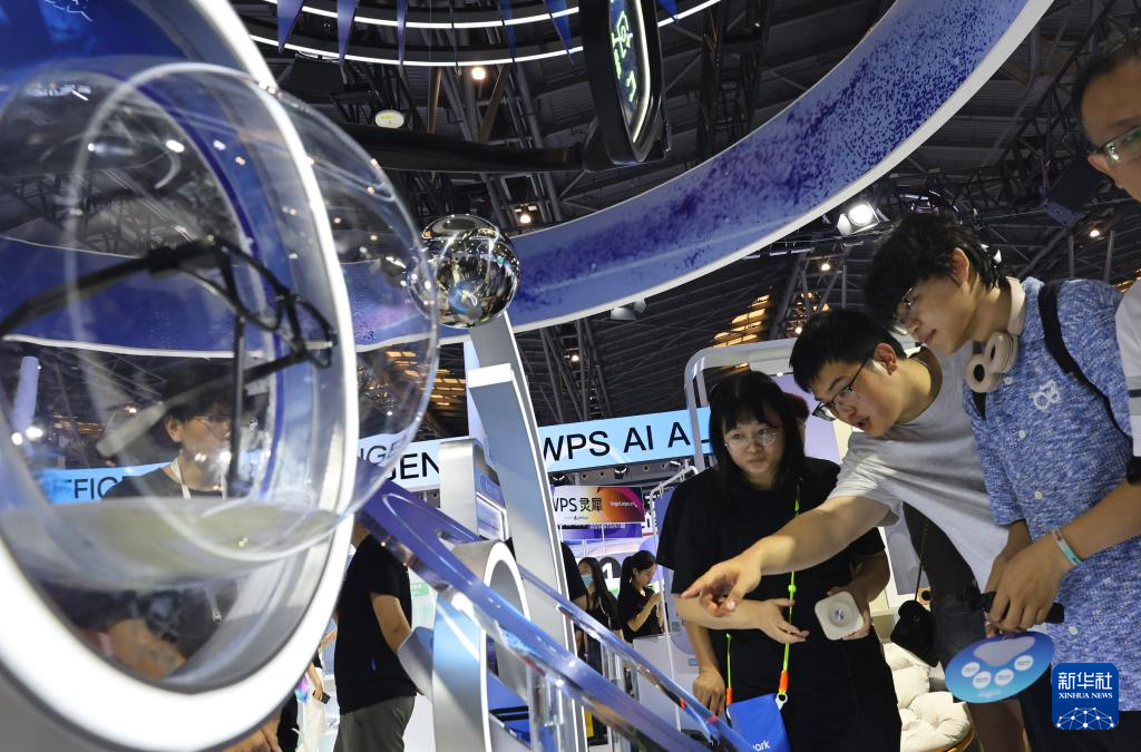 7月27日,参观者在展览现场体验使用WPSAI办公操作系统。