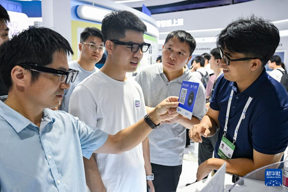 7月27日,参观者在一个工业智能体系统操作演示展台前驻足观看。