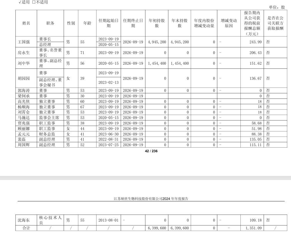 从硕世生物2024年披露的高管薪酬看,2024年,硕世生物共有七位高管的年薪超百万元。其中,房永生的年薪为206.43万元,王国强的年薪为243.99万元,董事、副总经理刘中华的年薪为151.62万元。另据公司公告,董事长王国强2021-2023年分别领取薪酬1689万、1550万、211.7万。
