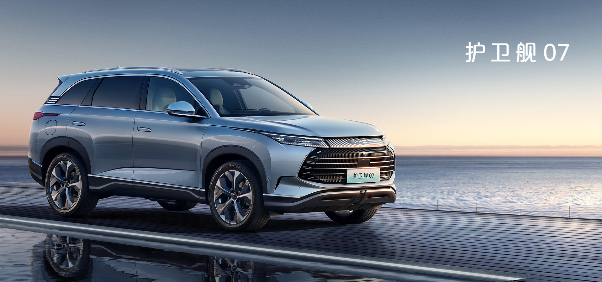 护卫舰07 100KM型有豪华、尊贵、旗舰三款车型,均采用1.5T发动机、145千瓦电动机和E-CVT变速器的动力组合,纯电续航100公里。