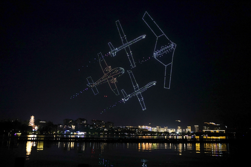这是7月11日晚在重庆市梁平区双桂湖国家湿地公园拍摄的无人机表演。新华社记者黄伟摄