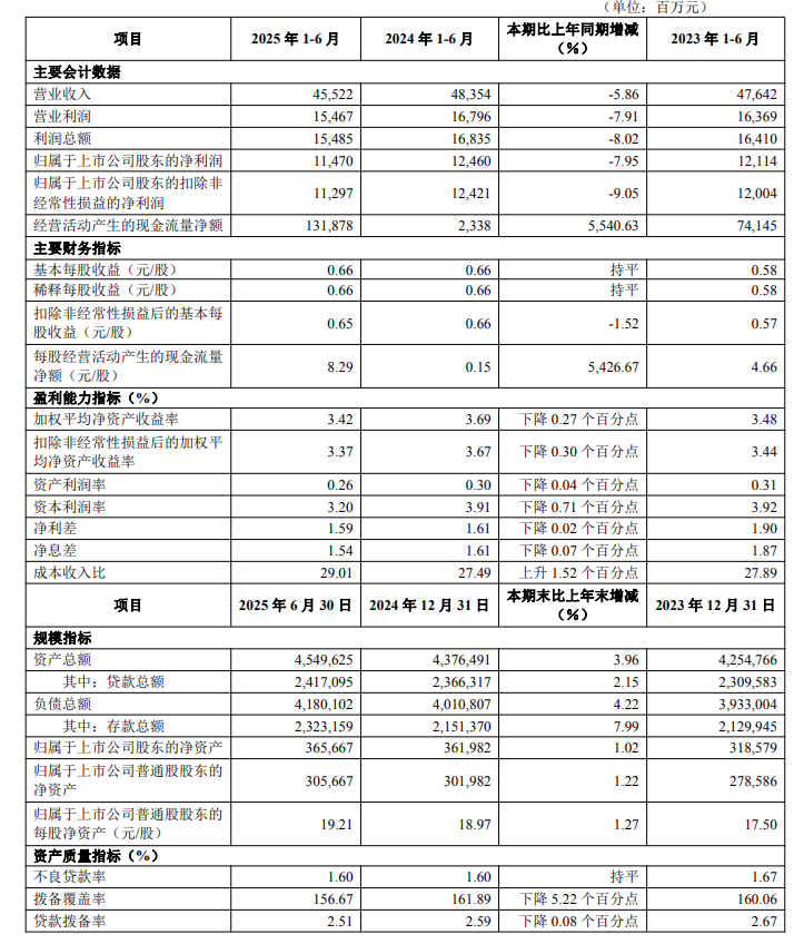 作为全国第五家上市银行,华夏银行于前不久公布了2025年半年度报告。报告期内该行实现营业收入455.22亿元,较上年同期483.54亿元下降5.86%;实现归母净利润114.7亿元,较上年同期的124.6亿元下降7.95%。数据显示,在9家A股上市股份制银行中华夏银行营业收入同比增速位列倒数第二,归母净利润同比增速位于倒数第一。