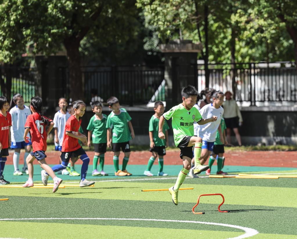 8月29日,浙江省诸暨市陶朱小学足球队员开展新学期首训。新华社记者徐昱摄