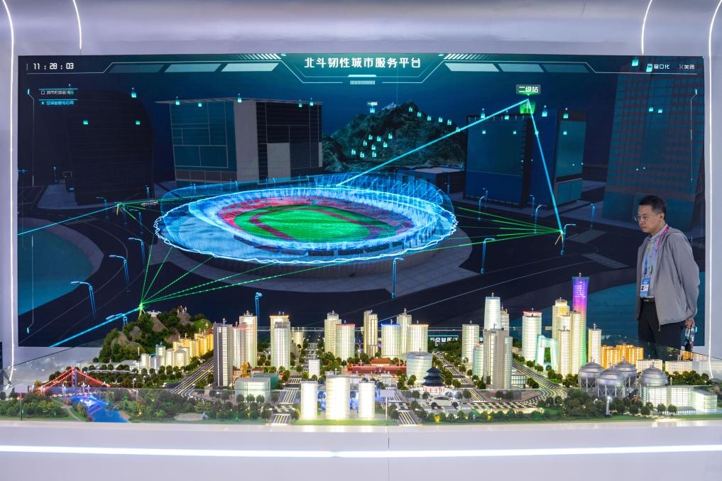 观众在了解配有北斗技术的城市安全风险综合监测预警平台。新华社记者陈思汗摄