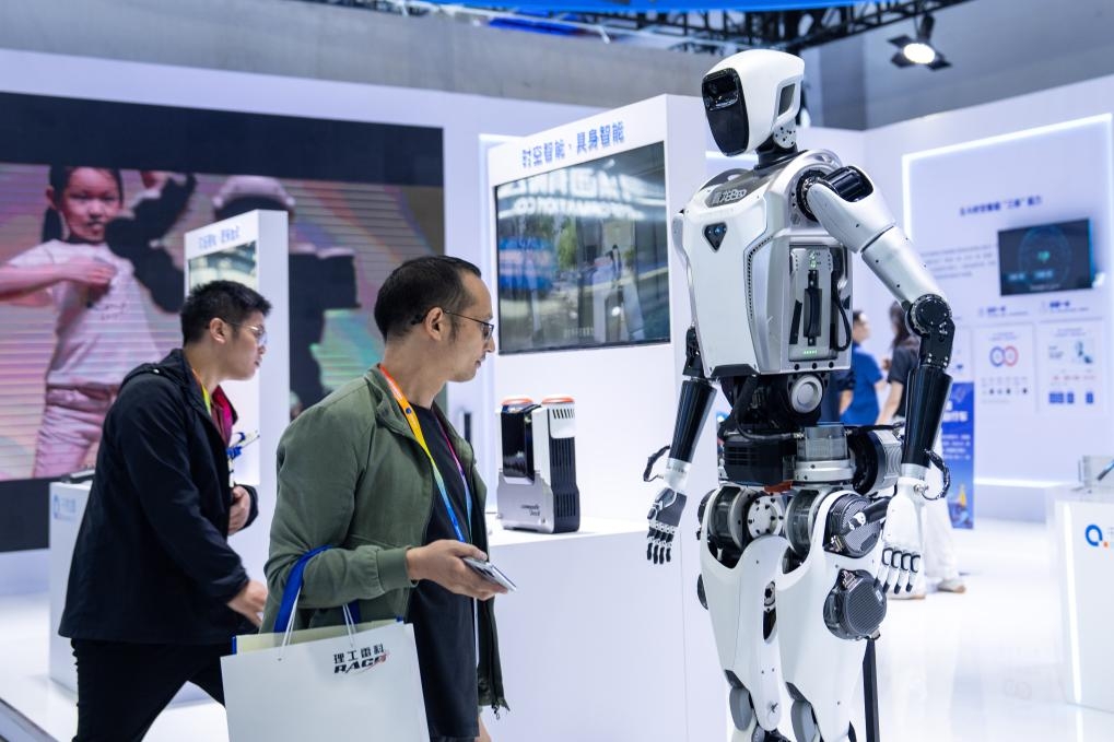 “背上‘时空算力背包’,人形机器人可以自主规划路线,精准感知户外位置。”千寻位置网络有限公司展示的人形机器人格外吸睛。现场工作人员介绍,“时空算力背包”融合AI等前沿技术,相当于给机器人配备了负责感知、推理和行动的“小脑”,将加速机器人从专用场景走向复杂空间。