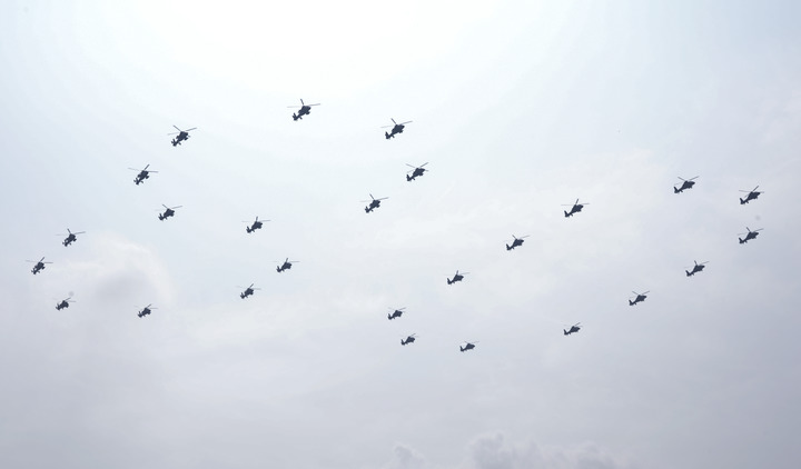 9月3日,纪念中国人民抗日战争暨世界反法西斯战争胜利80周年大会在北京隆重举行。这是空中护旗梯队通过天安门广场,26架直-19武装直升机组成“80”字样。新华社记者陈晔华摄