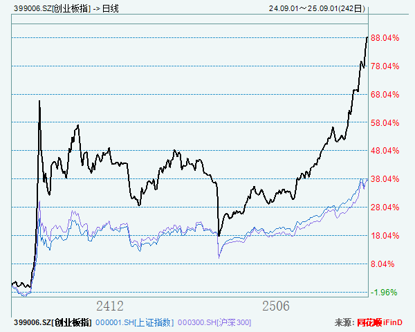 一是,近期美联储转鸽,市场认为9月降息概率大幅增加,国内利率也一直处于下行通道,市场资金流入A股的热情也很高。流动性宽松,成长股更受益,而创业板指是A股最具代表性的成长风格宽基指数之一(甚至没有之一);