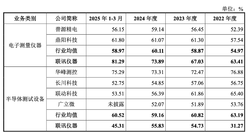 报告期内,联讯仪器综合毛利率分别为43.61%、60.50%、63.63%和65.33%。其中,电子测量仪器毛利率分别为63.41%、67.03%、73.89%和81.29%,整体高于同行业可比公司,主要系产品应用场景存在差异和稀缺性显著两方面原因所致。半导体测试设备毛利率分别为31.27%、54.73%、55.83%和45.31%,变动趋势与同行业可比公司存在一定差异。