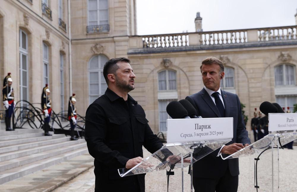 9月3日,在法国巴黎总统府爱丽舍宫,法国总统马克龙(右)与来访的乌克兰总统泽连斯基共同会见记者。法国总统马克龙3日在总统府爱丽舍宫会见来访的乌克兰总统泽连斯基时表示,欧洲已准备好在俄乌达成和平协议后向乌克兰提供安全保障。新华社记者高静摄