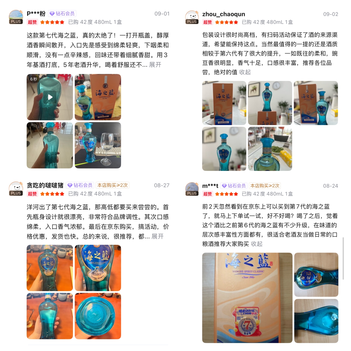 在京东评论区,消费者对品牌、品味、品格出众的洋河产品释放了火热激情,“为了中秋特地准备了三箱海之蓝招待朋友,包装精美大气,口感醇厚有层次。”
