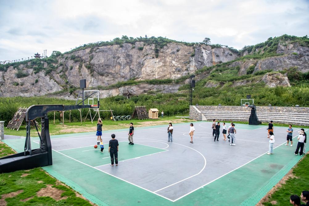 8月16日,在重庆市北碚区静观镇中华村,游客在矿坑修复改造的运动场内打球。新华社记者唐奕摄