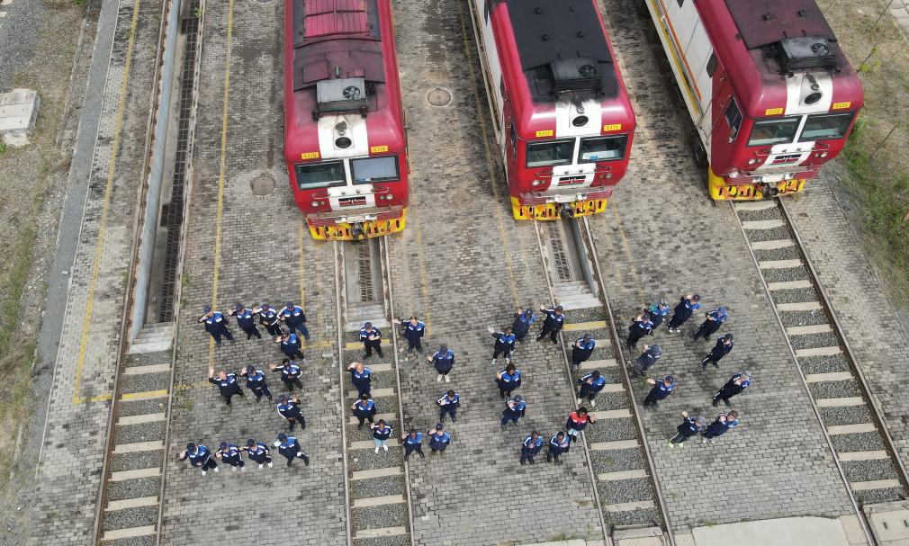 2025年8月19日,在肯尼亚内罗毕非洲之星铁路运营有限责任公司机务运转整备场,中肯两国铁路工作者在机车前站列并组成“3000”字样,以纪念蒙内铁路实现安全运营3000天(无人机照片)。新华社记者杨光摄