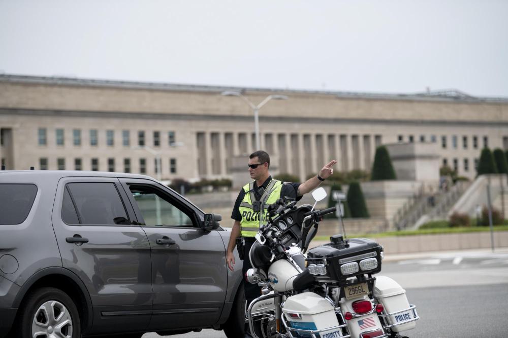 2021年8月3日,一名警察在美国弗吉尼亚州阿灵顿的五角大楼附近执勤。新华社记者刘杰摄