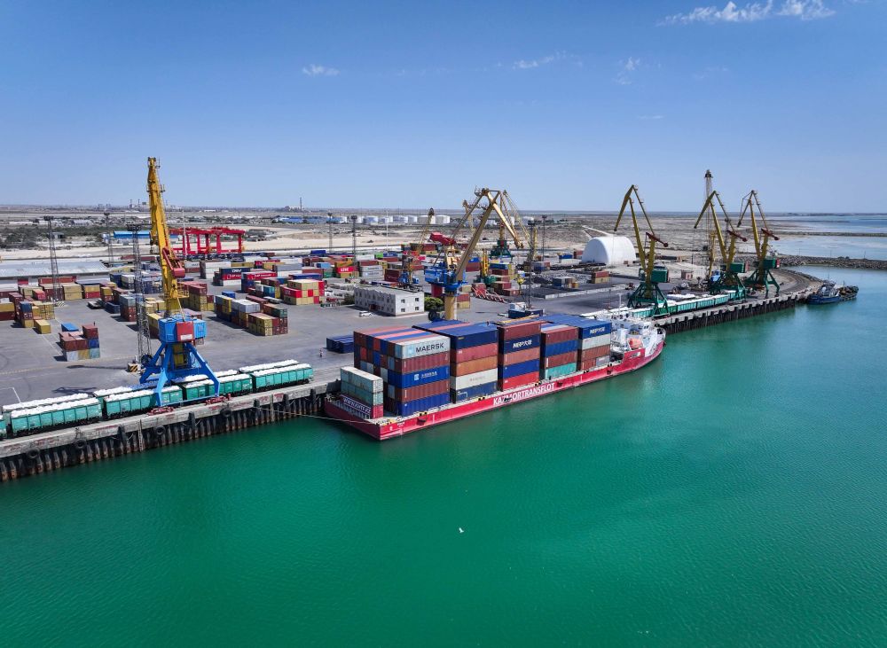 8月6日,一艘货轮停靠在哈萨克斯坦阿克套港(无人机照片)。新华社记者李任滋摄