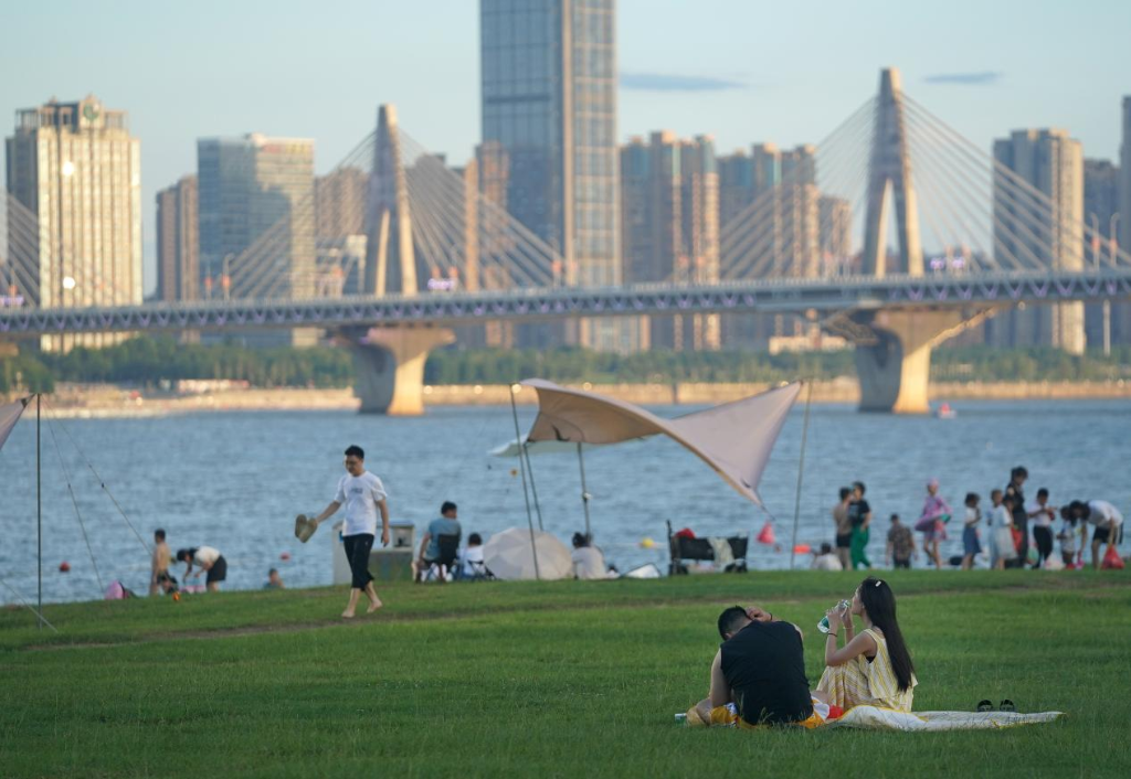 游人在位于南昌市红谷滩区的摩天湾天然泳场休闲纳凉。新华社记者万象摄