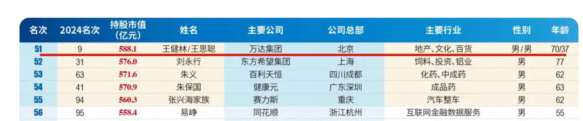 排名下滑更明显:2024年还排第9名,2025年直接掉到了第51名,一下差了42位。其实这也不意外,万达的经营状况直接影响家底,财富缩水这么多,也反映出市场对万达未来的信心在变化。