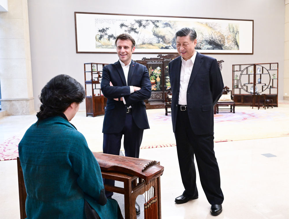 2023年4月7日,国家主席习近平在广东省广州市松园同法国总统马克龙举行非正式会晤。这是两国元首在白云厅欣赏古琴演奏。新华社记者岳月伟摄